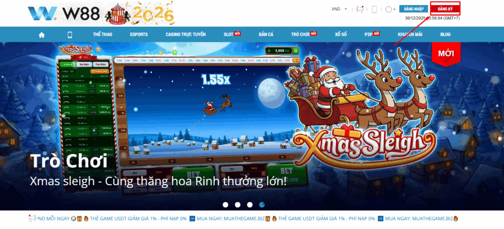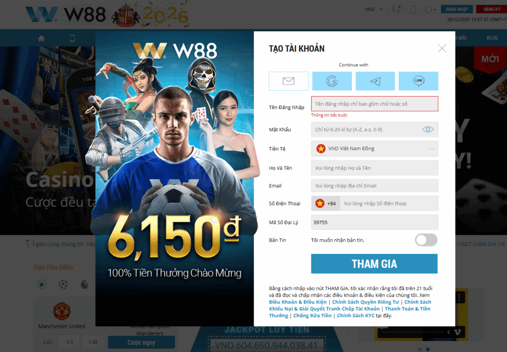 Ngay sau khi truy cập W88, biểu mẫu yêu cầu đăng ký sẽ tự động hiện lên. Nếu không thấy popup này bật lên, người chơi có thể bấm “Đăng ký” ở góc trên bên phải, ngay trên thanh menu chính đầu trang.