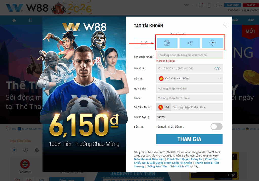 - Truy cập trang đăng ký W88 và chọn biểu tượng Gmail, Telegram hoặc Line.