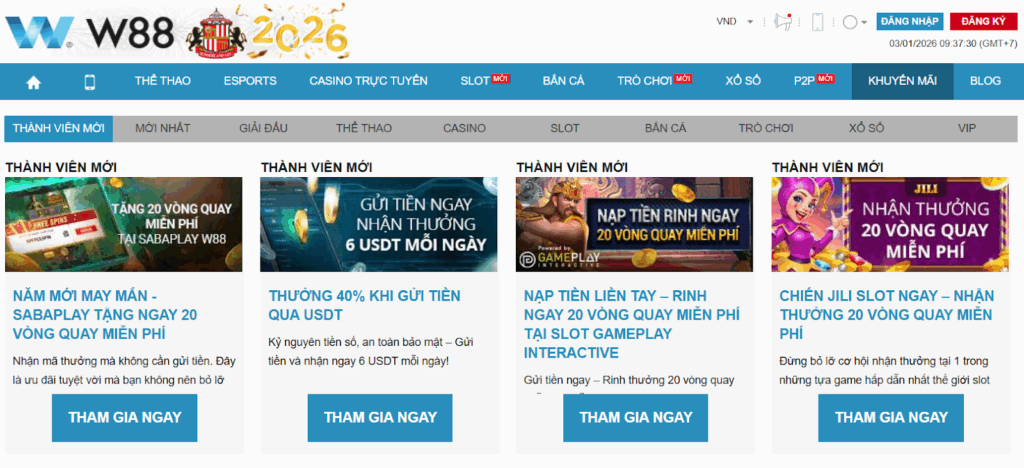 W88 nổi tiếng là nhà cái đặc biệt ưu ái thành viên mới với loạt khuyến mãi lớn ngay từ khi đăng ký. Người chơi có thể nhận tiền thưởng, vòng quay miễn phí và cược thử để làm quen hệ thống trước khi tham gia chính thức. Đây là lợi thế rất lớn giúp tân binh gia tăng vốn cược và trải nghiệm đầy đủ sản phẩm tại W88.