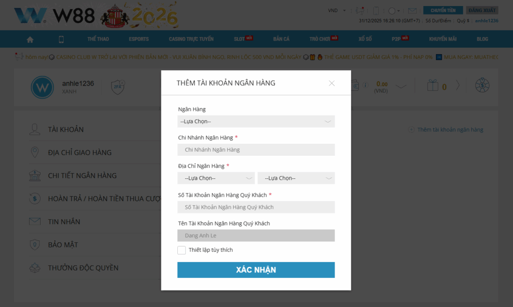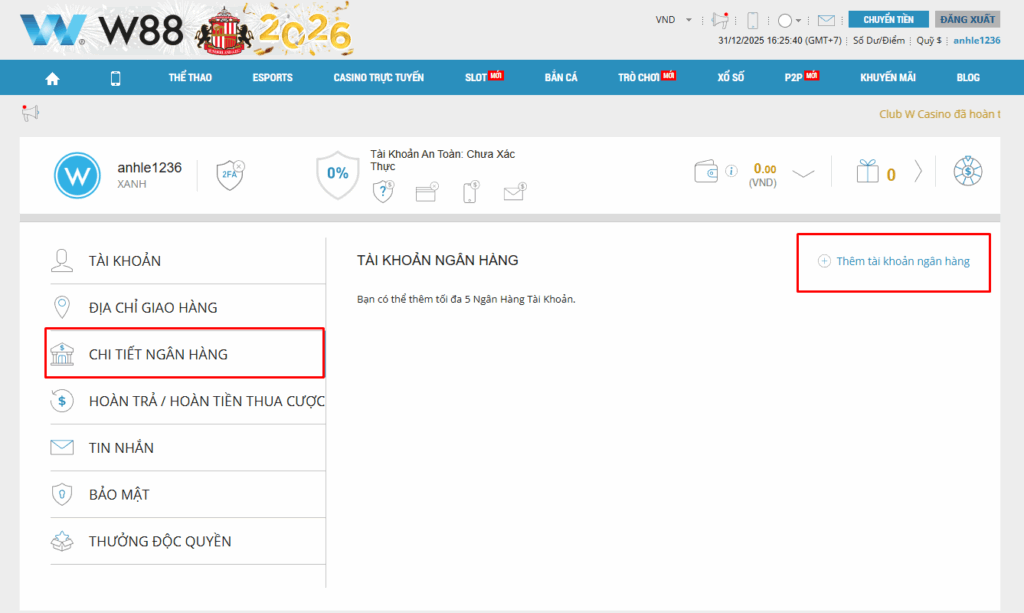 - Bước 3: Chọn phần “Chi tiết ngân hàng” và bấm nút để thêm thông tin tài khoản ngân hàng ở góc phải màn hình, tài khoản này sẽ dùng làm tài khoản nhận tiền sau khi rút từ W88.