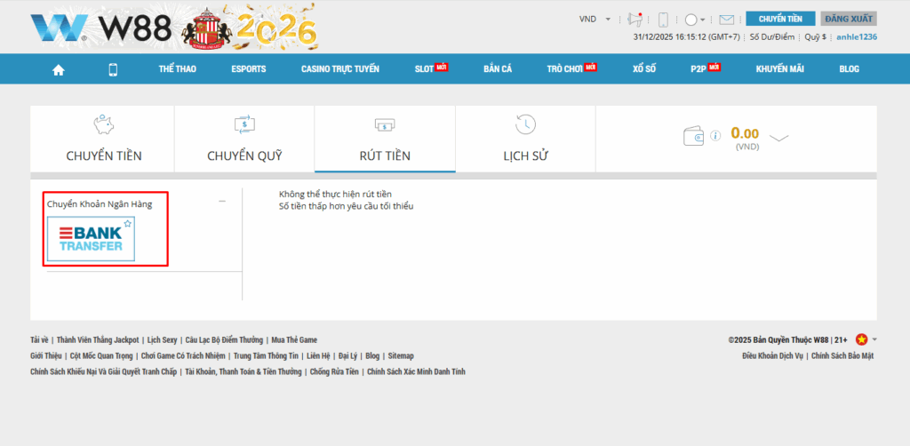 Rút tiền về tài khoản ngân hàng là phương thức phổ biến nhất tại W88 nhờ tính ổn định cao, thời gian xử lý nhanh và dễ dàng đối soát khi cần. Chỉ cần thao tác đúng quy trình, tiền thắng cược của bạn sẽ được chuyển thẳng về tài khoản cá nhân một cách an tâm.