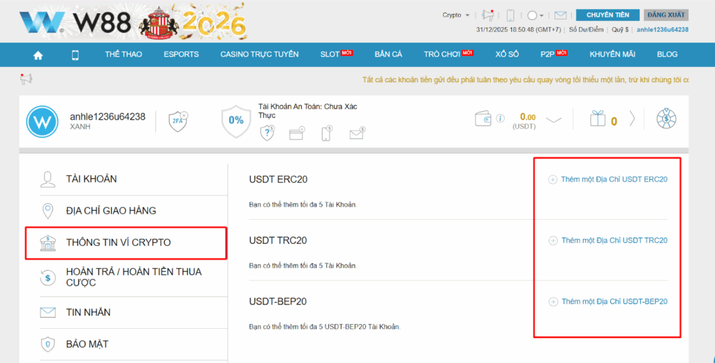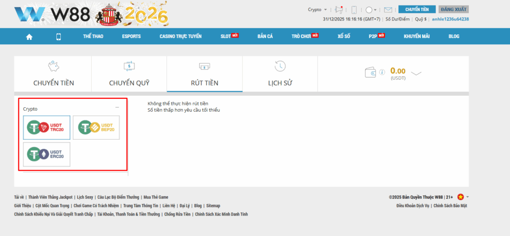 Rút tiền W88 bằng USDT nhanh gọn và bảo mật
