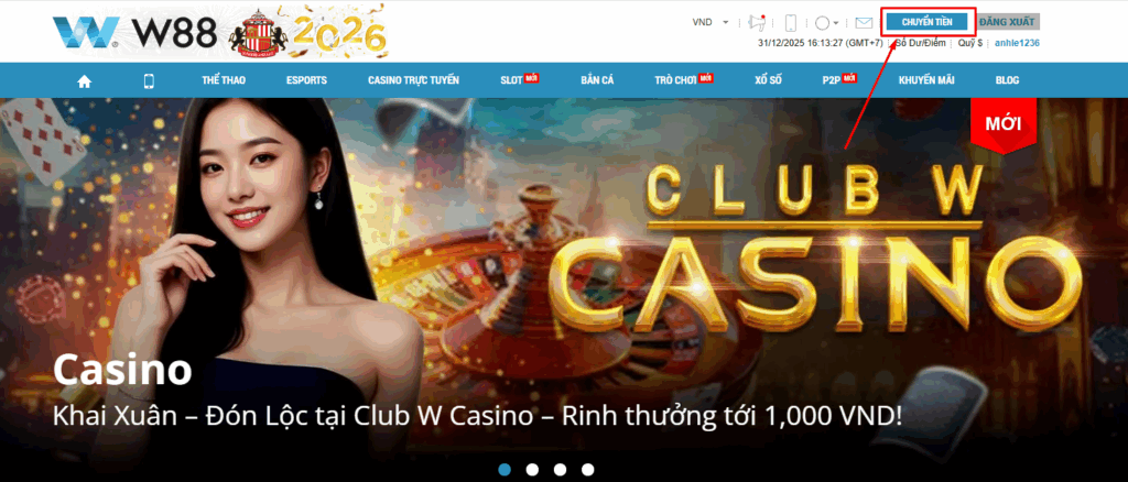 - Bước 1: Đăng nhập W88, vào mục “Chuyển tiền”, chọn “Chuyển quỹ” để đưa tiền từ các sảnh như Casino, Thể thao hoặc Slot về Tài khoản chính.