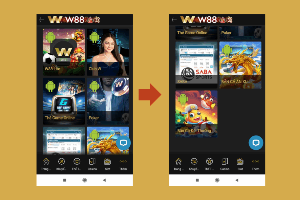 - Lựa chọn các phiên bản ứng dụng như W88 Lite, Club W, Thẻ game online, Poker, SABA, Bắn cá ăn xu, Bắn cá đổi thưởng để tải về